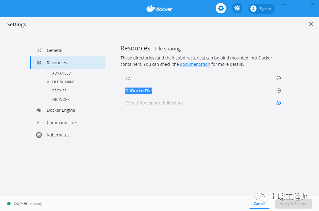 -v 后面就是Docker容器文件映射的命令,冒号前面 /tmp/skeleton 是宿主机的路径,就是WIN10电脑的文件路径,冒号后面 /hyperf-skeleton 是容器的文件路径,这个不用管,这里我们要对文件映射进行修改,win10系统有盘符,我来一个 D\DockerFile\test ,这里要设置一下Docker 的File sharing,增加一个 D:\DockerFile的路径,不然会报错的。