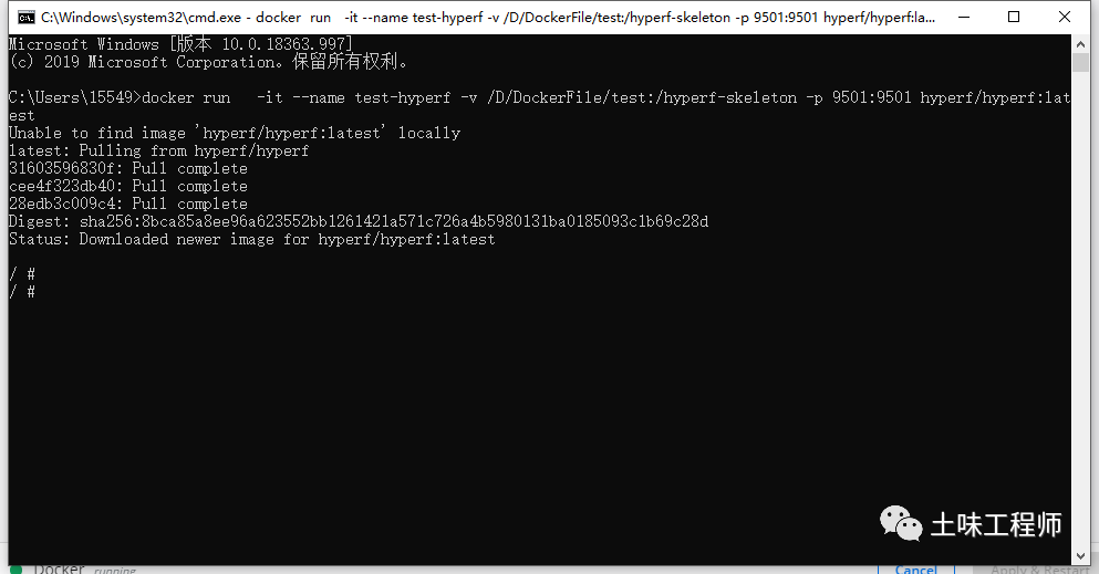 docker run -it --name test-hyperf -v /D/DockerFile/test:/hyperf-skeleton -p 9501:9501 hyperf/hyperf:latest
