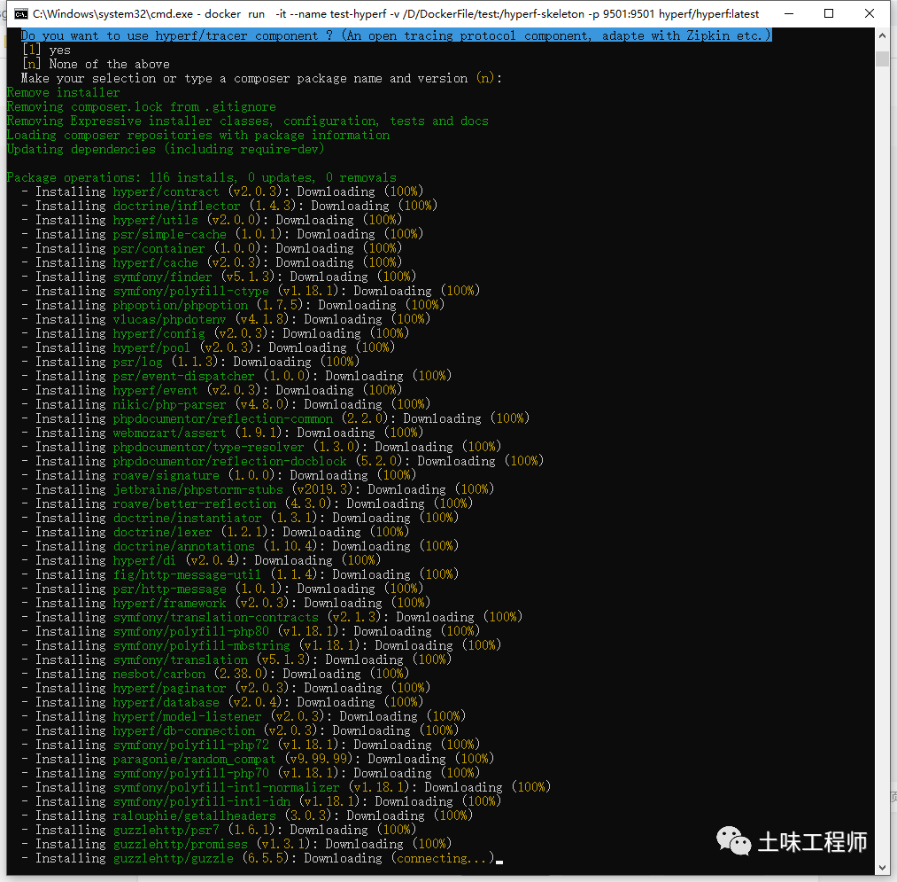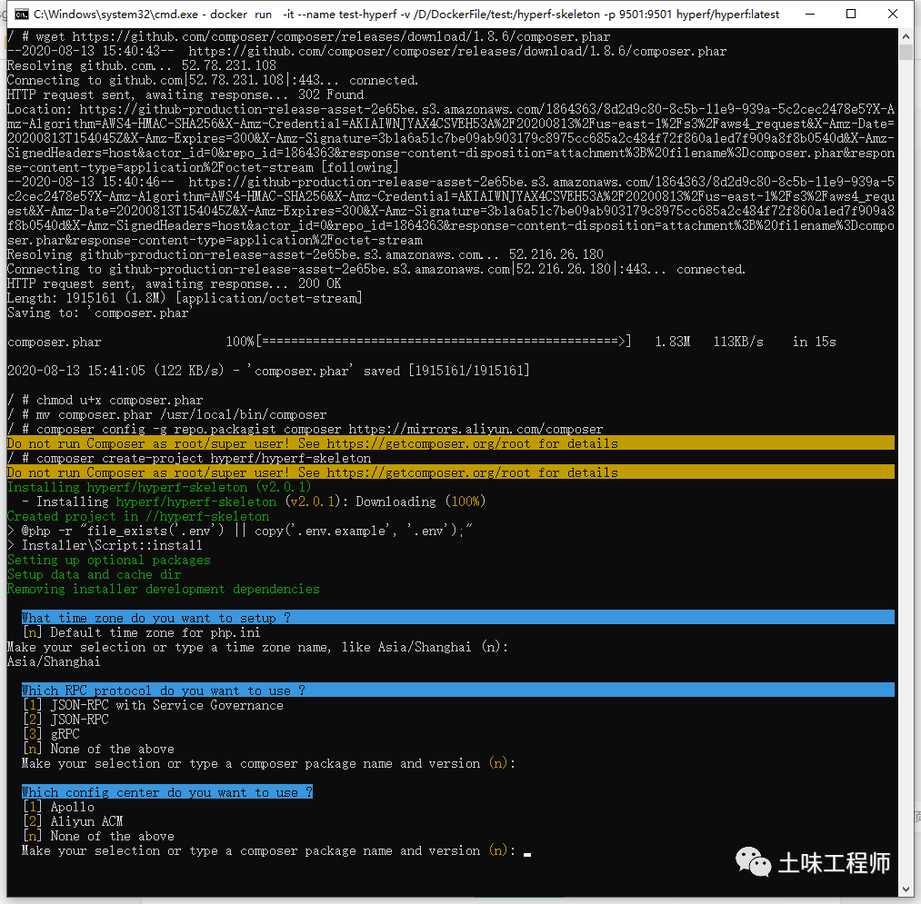 # 镜像容器运行后,在容器内安装 Composerwget https://github.com/composer/composer/releases/download/1.8.6/composer.pharchmod u+x composer.pharmv composer.phar /usr/local/bin/composer# 将 Composer 镜像设置为阿里云镜像,加速国内下载速度composer config -g repo.packagist composer https://mirrors.aliyun.com/composer# 通过 Composer 安装 hyperf/hyperf-skeleton 项目composer create-project hyperf/hyperf-skeleton