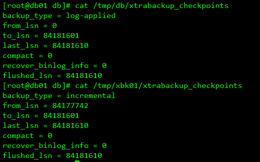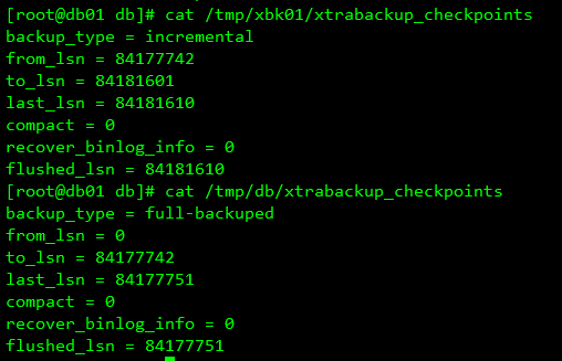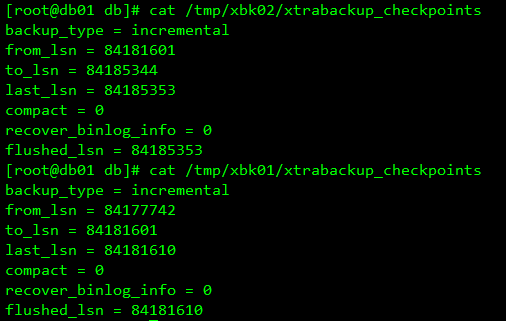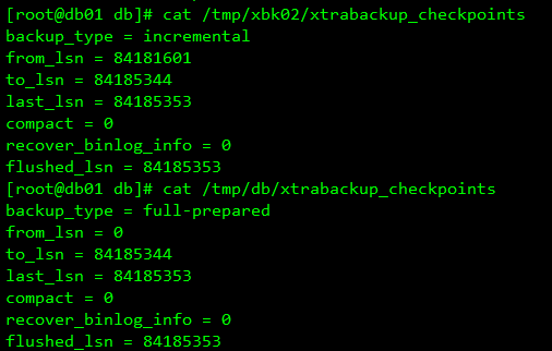 此处使用cat命令整理后两个的xbk02和xbk的xtrabackup_checkpoints文件,last_lsn号是否相同.相同表示整理成功