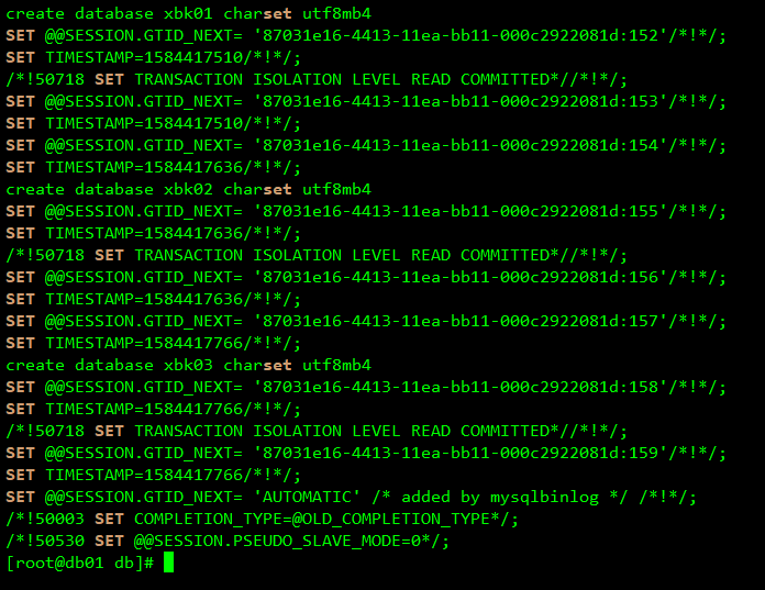mysqlbinlog --skip-gtids --include-gtids='87031e16-4413-11ea-bb11-000c2922081d:157-159' /data/mysql/log-bin.000004 > /tmp/log-bin.sql恢复数据备份