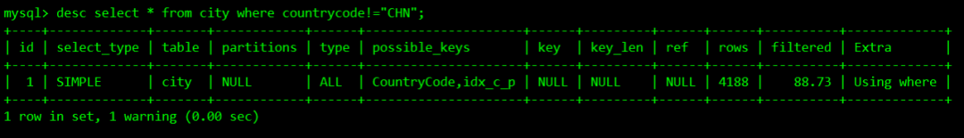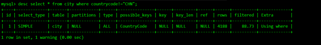 下面图中type值为ALL,意味着select * from city where countrycode!="CHN";这条语句执行计划是全表扫描,然后看下possible-keys,对应的值为CountryCode,说明它有可能走,但不一定走。再查看key值为NULL,表示未使用索引