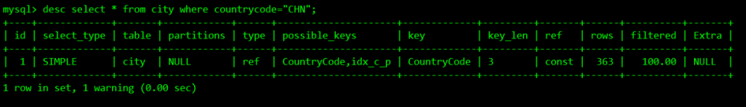 下面图中type值为ALL,意味着select * from city where countrycode="CHN";这条语句执行计划是全表扫描,然后看下possible-keys,对应的值为CountryCode,idx_c_p,说明它有可能走,但不一定走。再查看key值为CountryCode,表示使用了索引