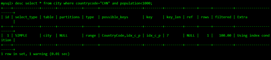 下面图中type值为ALL,意味着desc select * from city where countrycode="CHN" and population<1000;这条语句执行计划是全表扫描,然后看下possible-keys,对应的值为CountryCode,idx_c_p,说明它有可能走,但不一定走。再查看key值为idx_c_p,表示使用了索引