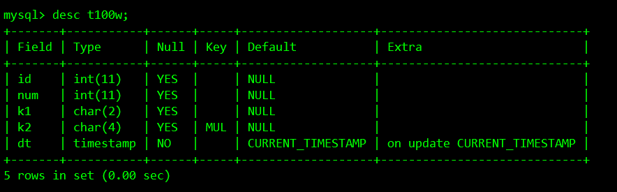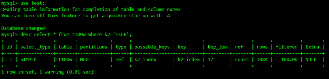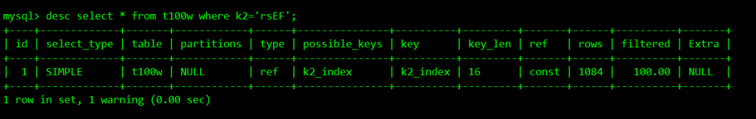 desc select * from t100w where k2='rsEF';
