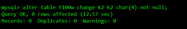alter table t100w change k2 k2 char(4) not null;在线DDL修改表,锁表时间12.57秒