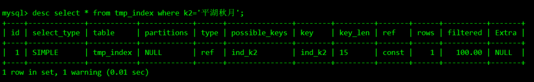 desc select * from tmp_index where k2='平湖秋月';
