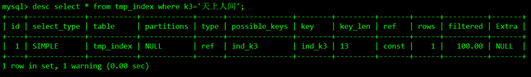 desc select * from tmp_index where k3='天上人间';