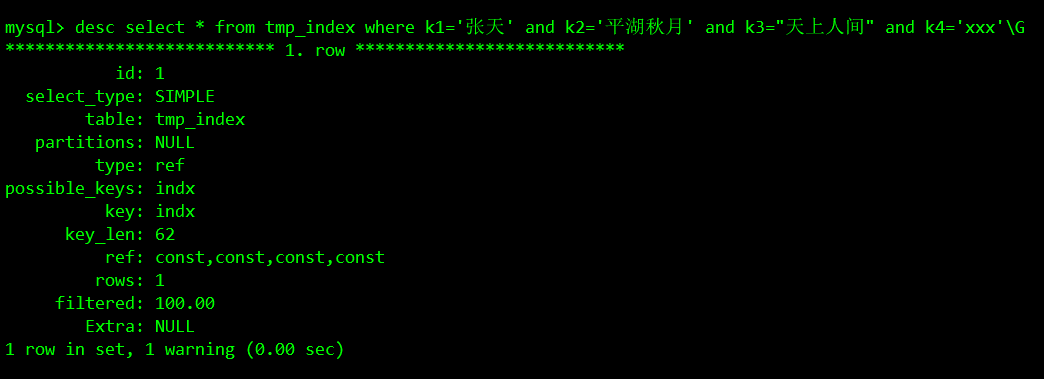 desc select * from tmp_index where k1='张天' and k2='平湖秋月' and k3="天上人间" and k4='xxx'\G下图中type为ref,是因为我们建立是辅助索引,而ref为4个const,是因为4个值都是唯一的,而key_len是62