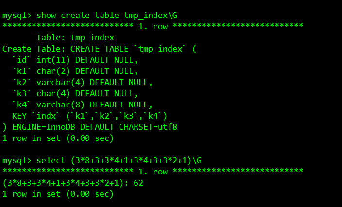 create table tmp_index(id int ,k1 char(2),k2 varchar(4),k3 char(4),k4 varchar(8) ) engine=innodb charset=utf8;