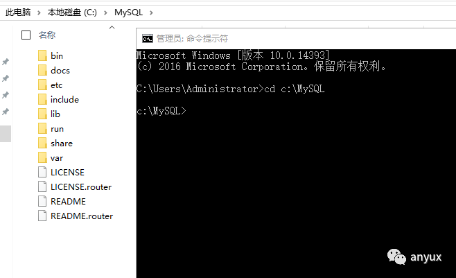 解压zip包到安装目录C:\MySQL(提示:系统中只有C盘,所以安装到C盘。如果有其他盘,请安装到其他盘符下),注意,安装里通过cmd打开命令,必须以管理员权限打开,否则安装时会出错,无法安装