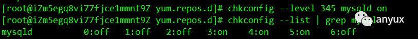 chkconfig --level 345 mysqld onchkconfig --list | grep mysql