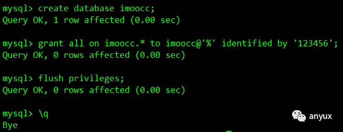 create database imoocc;grant all on imoocc.* to imoocc@'%' identified by '123456';flush privileges;
