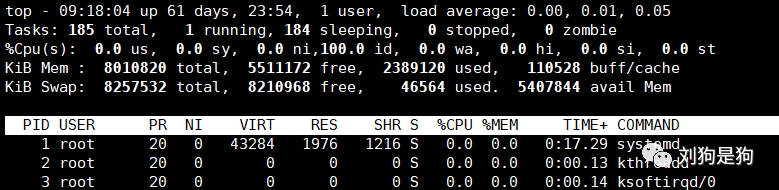 1h: top - 09:18:04 up 61 days, 23:54, 1 user, load average: 0.00, 0.01, 0.05