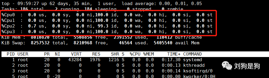 | load average: 0.00, 0.01, 0.05 | 负载值 1分钟 5分钟 10分钟 (满负荷值相当于CPU核数) |