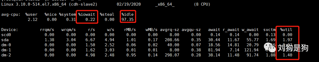如果%iowait的值过高,表示硬盘存在I/O瓶颈,