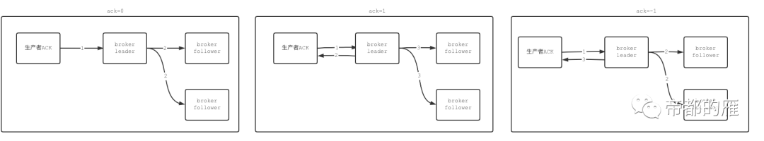 缺点:leader在ack后,还未来得及将消息同步给follower就宕机了,kafka集群新的leader并没这条消息,原leader启动后,由于高水位线机制(下文会讲到),也不会有这条消息,该消息丢失。