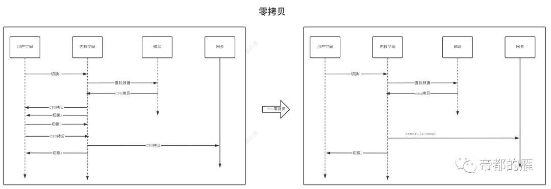 整个过程cpu切换两次,cpu拷贝0次。