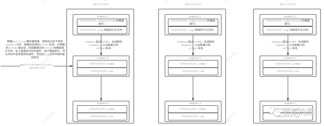 segment中由.index和.log组成。.index为offset的稀疏索引,key为offset,value为地址指针;.log为实际存放消息的文件,key为地址指针,value为消息体。
