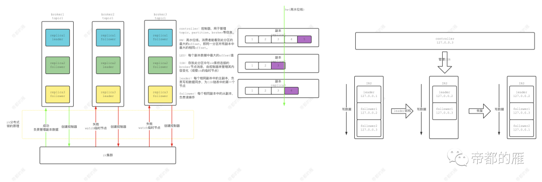 管理副本选举以及topic分配等操作,通过分布式锁的方式创建。(多个broker去zk上创建相同的临时节点,谁创建成功谁就是controller,其余broker订阅该节点,当controller宕机后,zk会自动删除,发送事件通知这些broker重新竞争)。