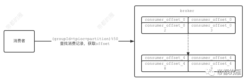 topic的日志文件中会消费者在分区中的消费记录,默认分成50个文件,来通过key(key=group-id.topic.partition)取模的方式,找到文件查询消费记录,进而消费下一个offset。
