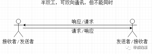 半双工:请求方和接收方传输方向双向,但同一时刻只能有一个传输,一个接收,如对讲机。