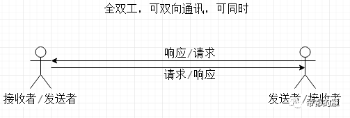 全双工:请求方和接收方传输方向双向,同一时刻可以双向传输,比如我们对话。