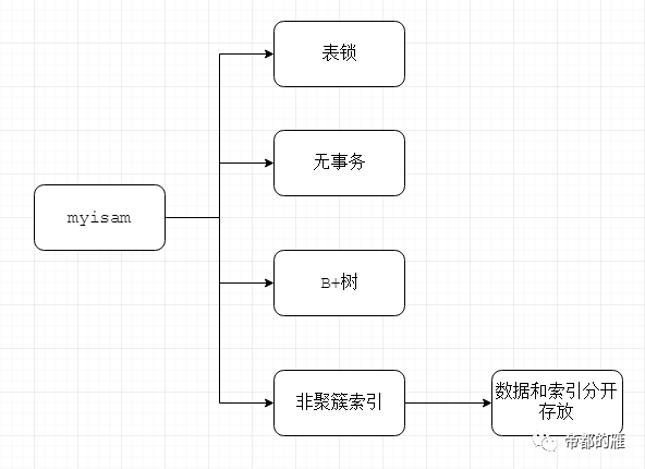 Mysql5.5前MyiSAM为默认的存储引擎。MyiSAM没有事务的概念,而且底层采用非聚簇索引,有表锁,使用需要高度注意,否则会产生锁表的问题。
