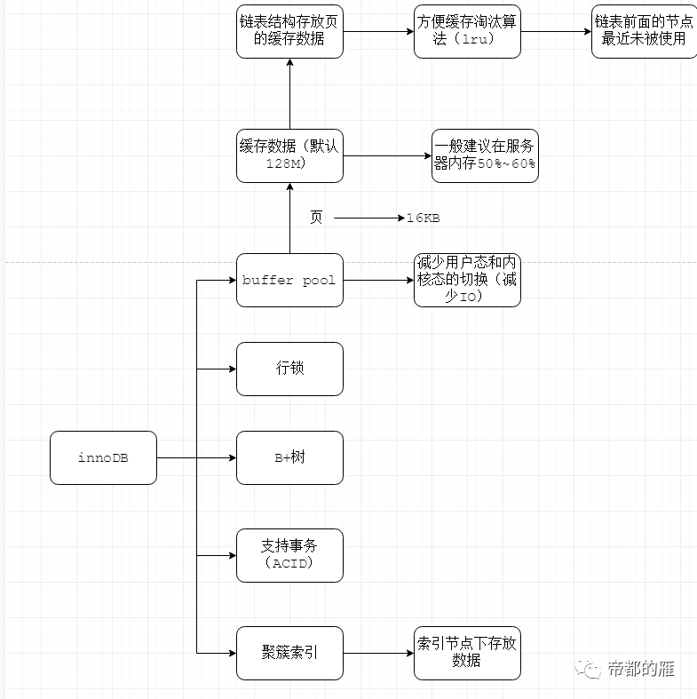 InnoDB为5.5版本开始的改进。支持事务(ACID),采用聚簇索引存放索引和数据,且支持行锁。还提供一个Buffer Pool的缓冲池用于缓存页数据。