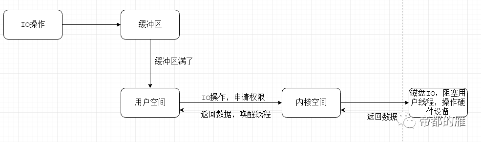 我们想要获取或保存数据,本质上都是在磁盘上进行IO操作。当应用程序发出此请求后,当前线程处于用户态,不能直接操作计算机硬件,需要进行权限申请,切换至内核态同时,用户线程阻塞等待。内核态IO处理之后,再切换回用户态,唤醒线程进行响应。