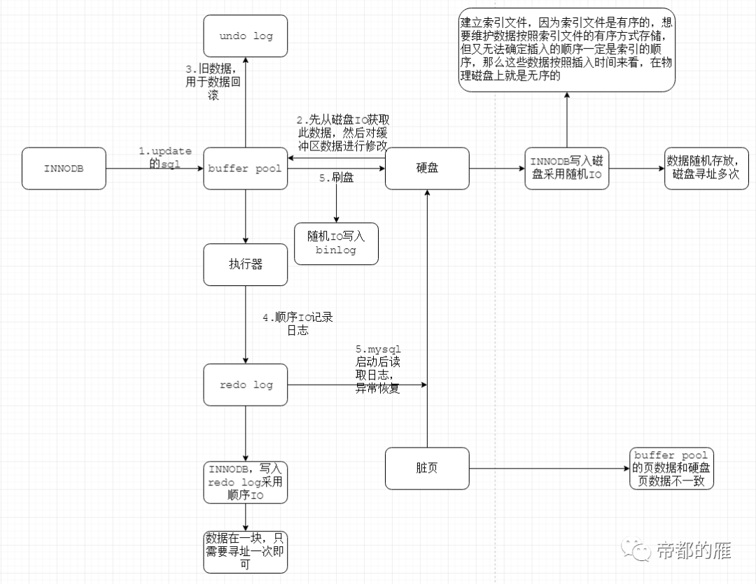 先经过词法分析、语法解析确保sql的正确性,然后将需要变更的数据先通过磁盘随机IO查询出来,放入到buffer pool 中,buffer pool将这些数据在以顺序IO的方式追加至undo.log中(用于事务回滚)。然后将buffer pool中的数据按照sql进行变更,变更后将变更日志以顺序IO的方式追加至redo.log中(用于异常恢复)。然后通过磁盘多次寻址的随机IO方式变更对应的数据,之后将磁盘数据的变动写入至mysql的bin.log中进行日志快照的备份。