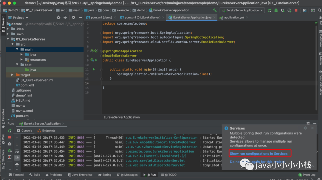 创建 Module -> Maven 工程作为 EurekaServer。自己建立启动文件等。