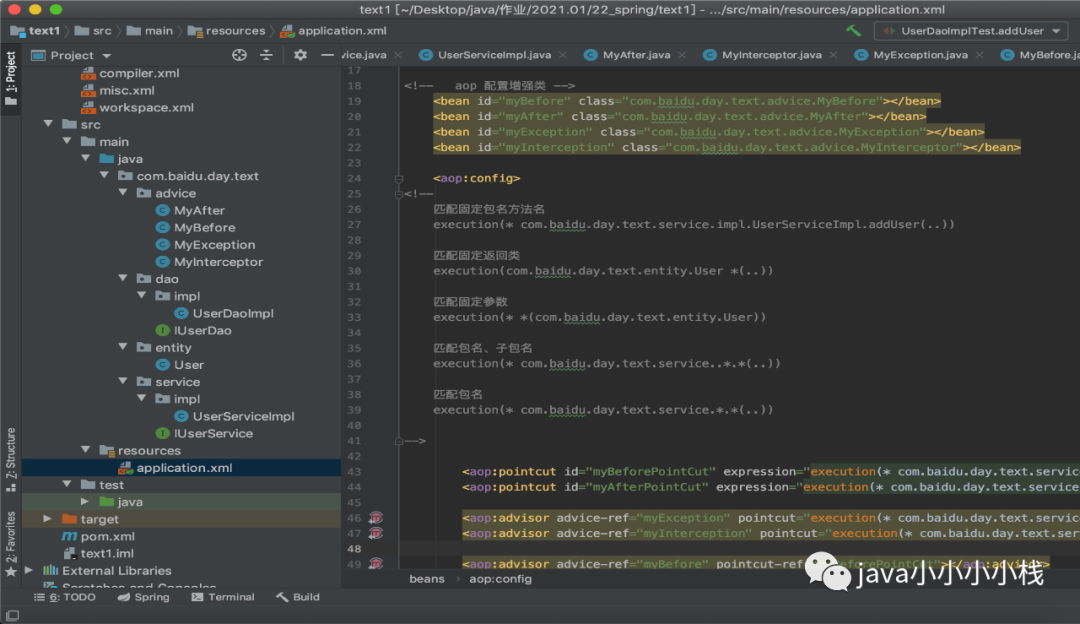 // application.xml<?xml version="1.0" encoding="UTF-8"?><beans xmlns="http://www.springframework.org/schema/beans"xmlns:xsi="http://www.w3.org/2001/XMLSchema-instance"xmlns:aop="http://www.springframework.org/schema/aop"xsi:schemaLocation="http://www.springframework.org/schema/beanshttp://www.springframework.org/schema/beans/spring-beans.xsdhttp://www.springframework.org/schema/aophttp://www.springframework.org/schema/aop/spring-aop.xsd"><bean id="userDao" class="com.baidu.day.text.dao.impl.UserDaoImpl"></bean><bean id="userService" class="com.baidu.day.text.service.impl.UserServiceImpl"><property name="userDao" ref="userDao"></property></bean><!-- aop 配置增强类 --><bean id="myBefore" class="com.baidu.day.text.advice.MyBefore"></bean><bean id="myAfter" class="com.baidu.day.text.advice.MyAfter"></bean><bean id="myException" class="com.baidu.day.text.advice.MyException"></bean><bean id="myInterception" class="com.baidu.day.text.advice.MyInterceptor"></bean><aop:config><aop:pointcut id="myBeforePointCut" expression="execution(* com.baidu.day.text.service.IUserService.addUser(..))"/><aop:pointcut id="myAfterPointCut" expression="execution(* com.baidu.day.text.service.impl.UserServiceImpl.addUser(..))"/><aop:advisor advice-ref="myException" pointcut="execution(* com.baidu.day.text.service.impl.UserServiceImpl.addUser(..))"></aop:advisor><aop:advisor advice-ref="myInterception" pointcut="execution(* com.baidu.day.text.service.impl.UserServiceImpl.addUser(..))"></aop:advisor><aop:advisor advice-ref="myBefore" pointcut-ref="myBeforePointCut"></aop:advisor><aop:advisor advice-ref="myAfter" pointcut-ref="myAfterPointCut"></aop:advisor></aop:config></beans>