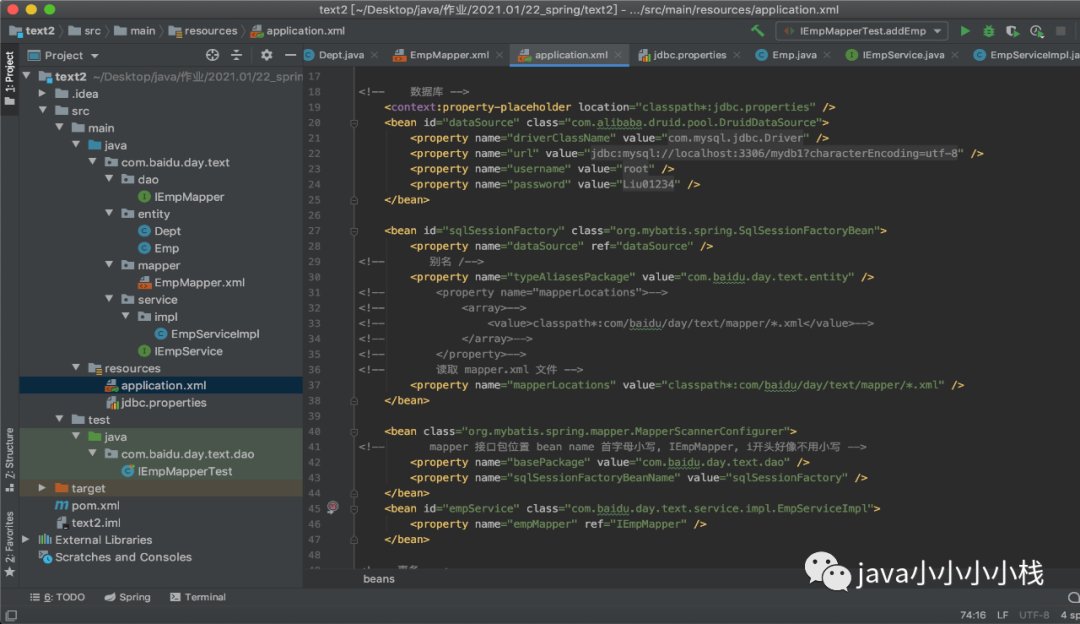 // spring.xml<?xml version="1.0" encoding="UTF-8"?><beans xmlns="http://www.springframework.org/schema/beans"xmlns:context="http://www.springframework.org/schema/context"xmlns:aop="http://www.springframework.org/schema/aop"xmlns:tx="http://www.springframework.org/schema/tx"xmlns:xsi="http://www.w3.org/2001/XMLSchema-instance"xsi:schemaLocation="http://www.springframework.org/schema/beanshttp://www.springframework.org/schema/beans/spring-beans.xsdhttp://www.springframework.org/schema/contexthttp://www.springframework.org/schema/context/spring-context.xsdhttp://www.springframework.org/schema/aophttp://www.springframework.org/schema/aop/spring-aop.xsdhttp://www.springframework.org/schema/txhttp://www.springframework.org/schema/tx/spring-tx.xsd"><!-- 数据库 --><context:property-placeholder location="classpath*:jdbc.properties" /><bean id="dataSource" class="com.alibaba.druid.pool.DruidDataSource"><property name="driverClassName" value="${jdbc.driver}" /><property name="url" value="${jdbc.url}" /><property name="username" value="${jdbc.username}" /><property name="password" value="${jdbc.password}" /></bean><bean id="sqlSessionFactory" class="org.mybatis.spring.SqlSessionFactoryBean"><property name="dataSource" ref="dataSource" /><!-- 别名 --><property name="typeAliasesPackage" value="com.baidu.day.text.entity" /><!-- <property name="mapperLocations">--><!-- <array>--><!-- <value>classpath*:com/baidu/day/text/mapper/*.xml</value>--><!-- </array>--><!-- </property>--><!-- 读取 mapper.xml 文件 --><property name="mapperLocations" value="classpath*:com/baidu/day/text/mapper/*.xml" /></bean><bean class="org.mybatis.spring.mapper.MapperScannerConfigurer"><!-- mapper 接口包位置 bean name 首字母小写, IEmpMapper, i开头好像不用小写 --><property name="basePackage" value="com.baidu.day.text.dao" /><property name="sqlSessionFactoryBeanName" value="sqlSessionFactory" /></bean><bean id="empService" class="com.baidu.day.text.service.impl.EmpServiceImpl"><property name="empMapper" ref="IEmpMapper" /></bean><!-- 事务 --><!-- 配置事务管理 --><bean id="transactionManager" class="org.springframework.jdbc.datasource.DataSourceTransactionManager"><property name="dataSource" ref="dataSource" /></bean><!-- 事务声明 --><tx:advice id="txAdvice" transaction-manager="transactionManager"><tx:attributes><!-- timeout 超时时间;rollback-for,碰到什么样的报错回滚;propagation,事务隔离级别; --><!-- <tx:method name="addEmp" propagation="REQUIRED" rollback-for="Exception" timeout="60"/>--><tx:method name="show*" read-only="true" propagation="SUPPORTS"/><tx:method name="get*" read-only="true" propagation="SUPPORTS"/><tx:method name="select*" read-only="true" propagation="SUPPORTS"/><tx:method name="add*" propagation="REQUIRED" rollback-for="Exception" /><tx:method name="update*" propagation="REQUIRED" rollback-for="Exception" /><tx:method name="del*" propagation="REQUIRED" rollback-for="Exception" /><tx:method name="delete*" propagation="REQUIRED" rollback-for="Exception" /><tx:method name="insert*" propagation="REQUIRED" rollback-for="Exception" /><!-- <tx:method name="*" propagation="REQUIRED" rollback-for="Exception" />--></tx:attributes></tx:advice><!-- 事务部署 --><aop:config><aop:advisor advice-ref="txAdvice" pointcut="execution(* com.baidu.day.text.service..*.*(..))"></aop:advisor></aop:config></beans>