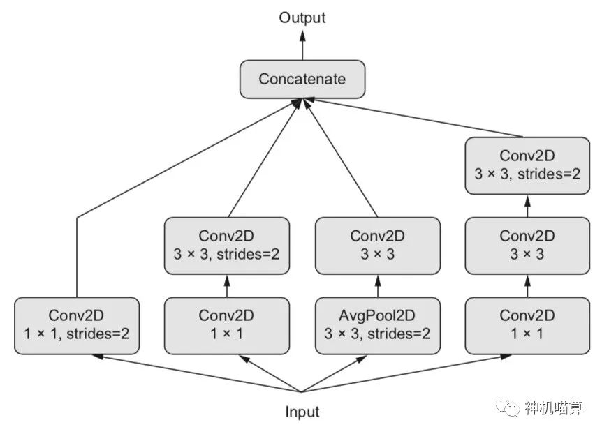 from keras import layers'''Every branch has the same stride value (2),which is necessary to keep all branch outputs the same size so you can concatenate them.'''branch_a = layers.Conv2D(128, 1,activation='relu', strides=2)(x)branch_b = layers.Conv2D(128, 1, activation='relu')(x)'''In this branch, the striding occurs in the spatial convolution layer.'''branch_b = layers.Conv2D(128, 3, activation='relu', strides=2)(branch_b)'''In this branch, the striding occurs in the average pooling layer.'''branch_c = layers.AveragePooling2D(3, strides=2)(x)branch_c = layers.Conv2D(128, 3, activation='relu')(branch_c)branch_d = layers.Conv2D(128, 1, activation='relu')(x)branch_d = layers.Conv2D(128, 3, activation='relu')(branch_d)branch_d = layers.Conv2D(128, 3, activation='relu', strides=2)(branch_d)'''Concatenates the branch outputs to obtain the module output'''output = layers.concatenate([branch_a, branch_b, branch_c, branch_d], axis=-1)