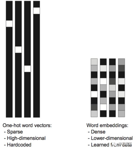 图6.2 one-hot编码和词嵌入得到的向量对比