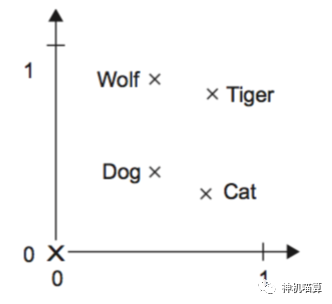 在图6.3中,cat、dog、wolf和tiger四个词被嵌入到二维平面空间。在这里选择的词向量表示时,这些词的语义关系能用几何变换来编码表示。比如,从cat到tiger和从dog到wolf有着相同的向量,该向量可以用“从宠物到野生动物”来解释。同样,从dog到cat和从wolf到tiger有相同的向量,该向量表示“从犬科到猫科动物”。