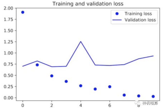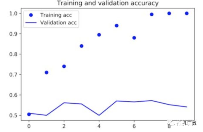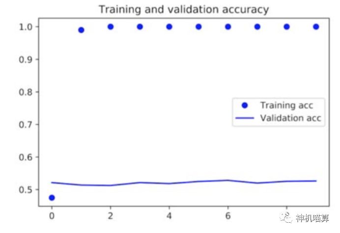 模型训练在开始不久即出现过拟合,这在训练集较少的情况下很常见。验证准确度有高的variance,不过也到50%了。