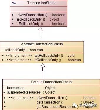 TransactionStatus,此对象定义了事务执行时的上下文。上下文中存储着当前事务对象、事务执行状态、被挂起的事务等事务执行时的上下文。
