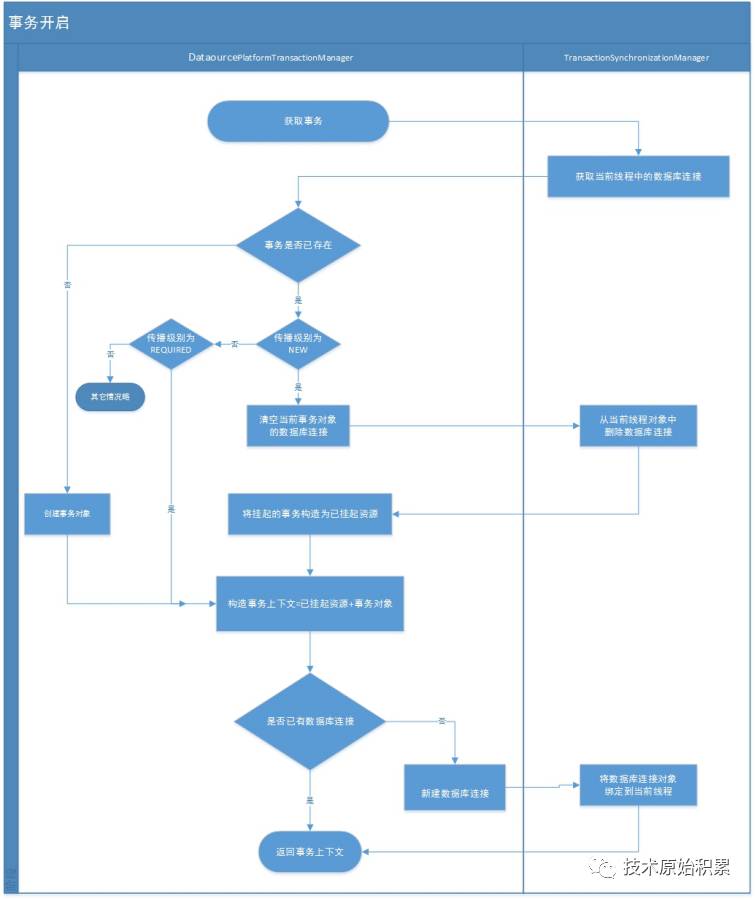 最常用的就是“加入当前事务”和“开启新事务”。传播行为的不同,会影响事务的开启、提交和回滚。 由于整个事务调用过程涉及流程复杂,以下就以简单的流程图概述,省去时序图
