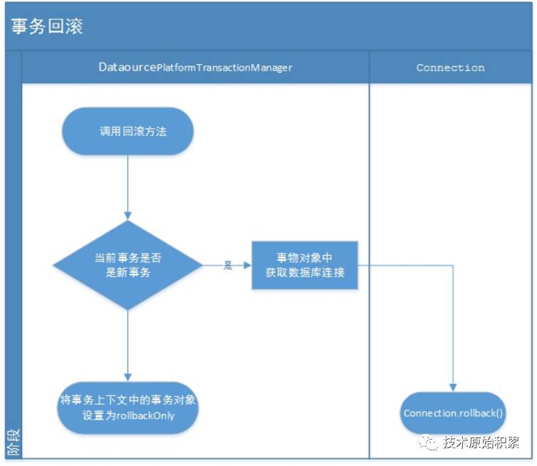spring中DataSourceTransactionObject是datasource方式事务对象的实现,并通过父类中的ConnectionHolder来持有Connection对象以及标识事务的活跃及回滚状态。