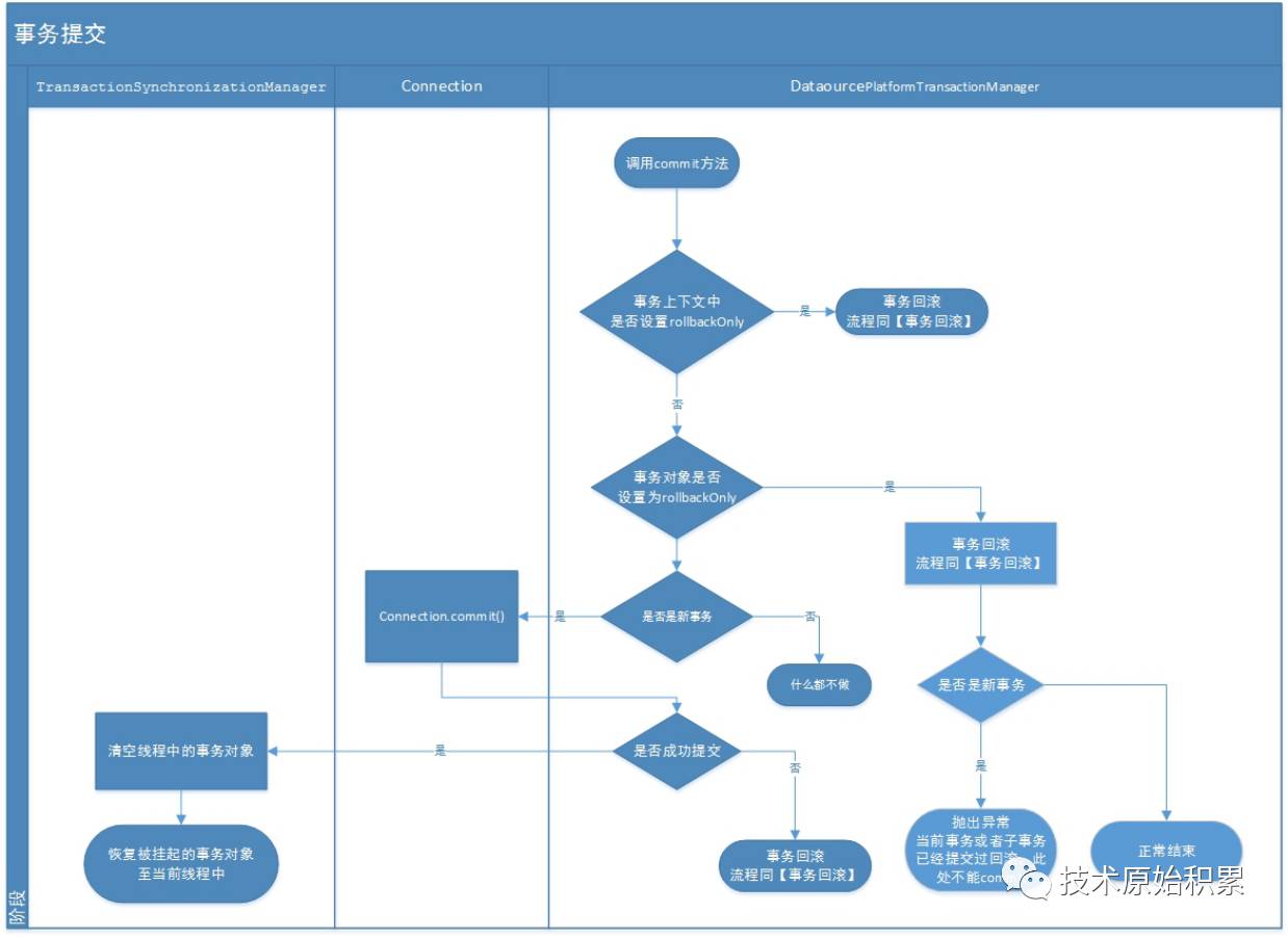 3.业务方法显式地调用、或者事务切面动态调用transactionManager的提交或回滚事务方法。提交或回滚事务时,从TransactionSynchronizationManager获取connection对象进行数据库操作。