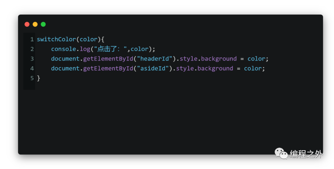 3、添加第一步中定义的点击事件,并接收传递的color参数,在点击事件中通过第二步添加的id定位到页面元素,直接给找到的元素设置背景颜色即可。