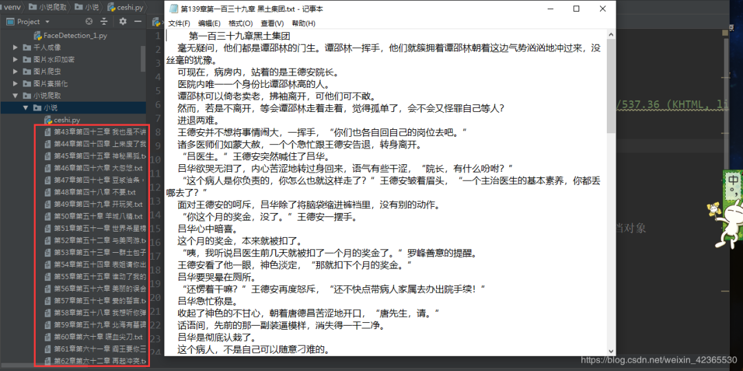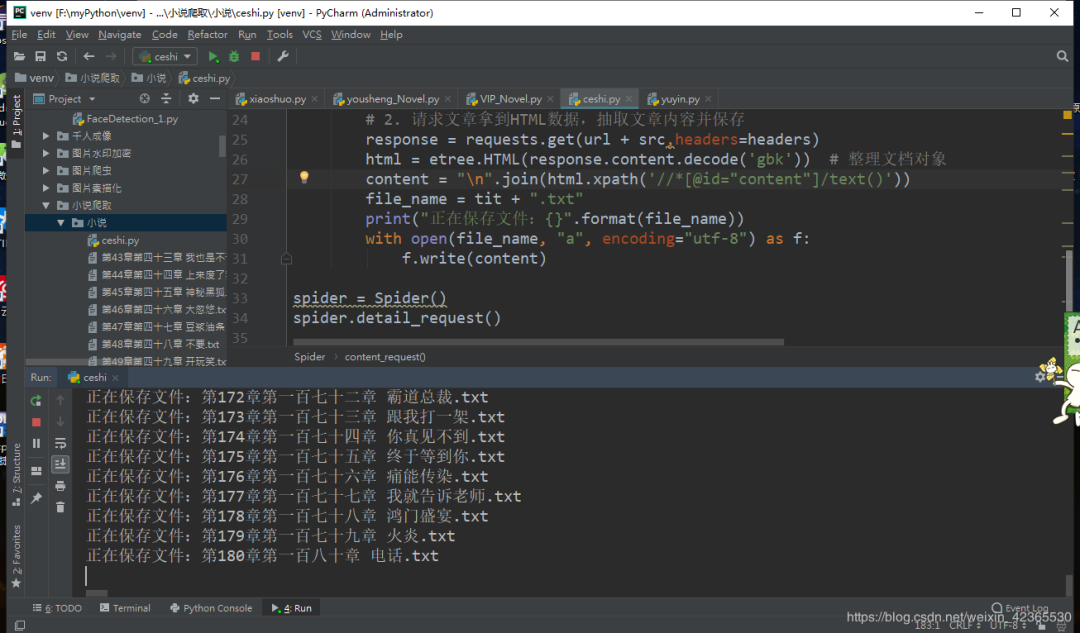 # 2. 请求文章拿到HTML数据,抽取文章内容并保存response = requests.get(url + src,headers=headers)html = etree.HTML(response.content.decode('gbk')) # 整理文档对象content = "\n".join(html.xpath('//*[@id="content"]/text()'))file_name = tit + ".txt"print("正在保存文件:{}".format(file_name))with open(file_name, "a", encoding="utf-8") as f:f.write(content)