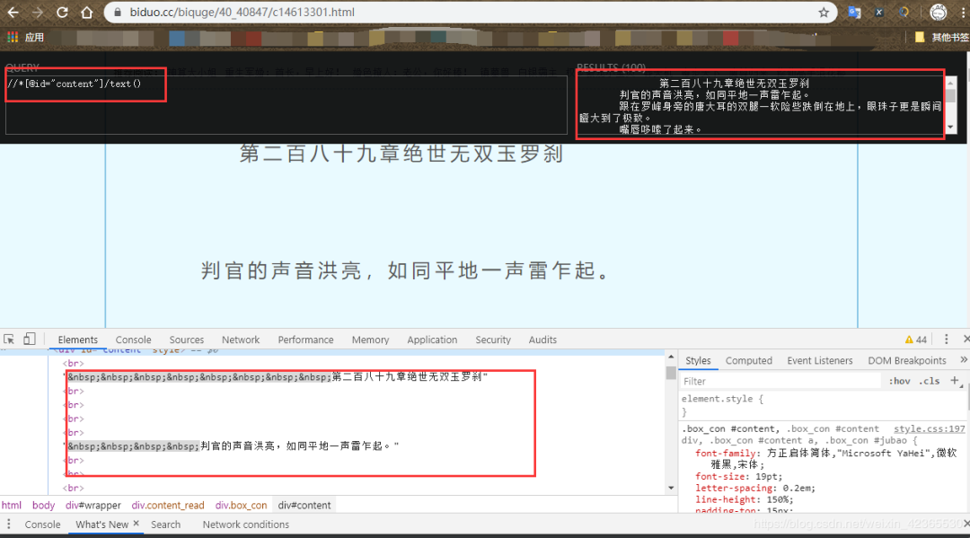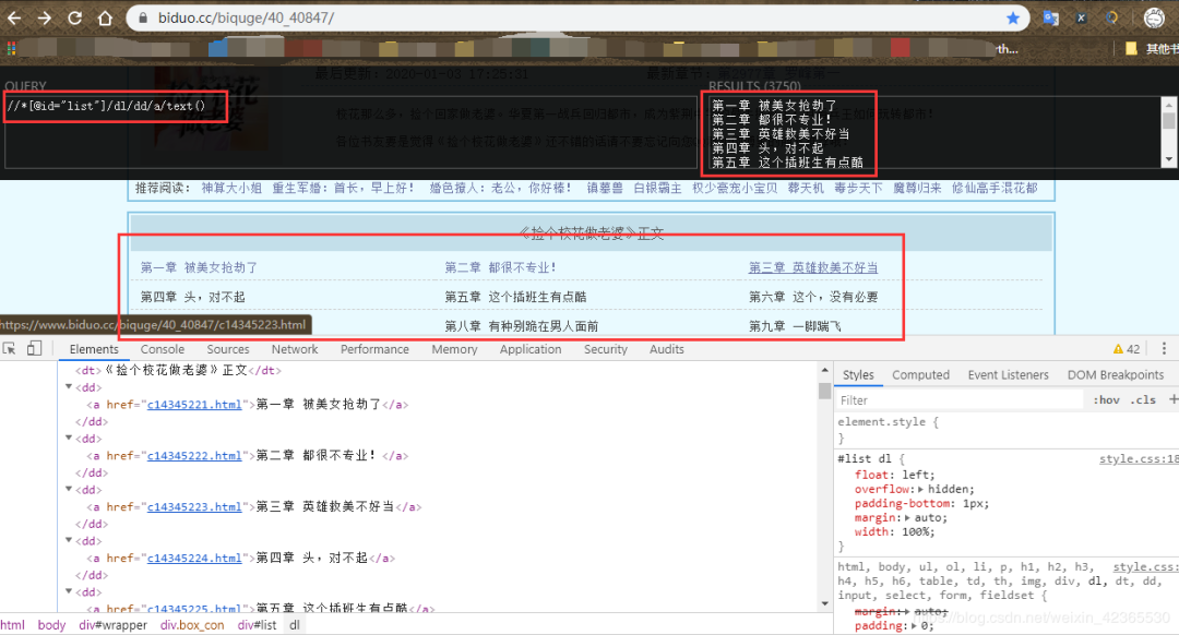 通过上面两个XPath语法,即可拿到我们需要的章节名称和对应的链接地址(PS:这里浏览器中的黑框小工具,是谷歌浏览器的一个扩展程序Xpath Help,需要这个扩展程序的小伙伴,可在我公众号回复 扩展程序 获取)