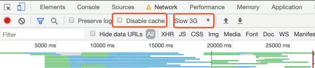 首先,我们在分析的时候,建议使用隐身模式打开页面,排除一些插件等因素对页面性能情况的影响。然后,我们把页面缓存勾选去掉,要测 disable cache 的情况,再把网络情况调整一下,我们用电脑打开页面的时候一般都连着 wifi 等,要更真实一些去测页面的性能,还是把网络调到 3G 等情况比较好,如图: