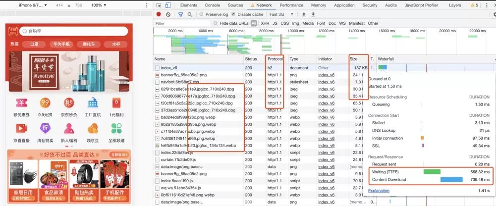 html 的大小为138kb,Content Download的时间为七百多毫秒,感觉可以拆分一下页面,非一二屏的内容分开加载。 TTFB(Time To First Byte)为五百多毫秒,在下载第一个字节之前等待的时间过久,不过这里主要是用户网络情况影响,可以做的比较少。如DNS解析优化,减少后端服务处理时间等 合并雪碧图,大轮播图下面的菜单分类那里的图标,可以用一张雪碧图来集合这些图标 顶部轮播图,在首次加载时,可以先加载第一帧的图片,后面几帧延后一下 图片较多,可以的话,都用 http2 协议