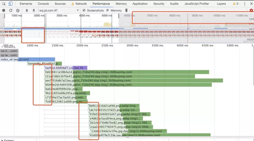 本次页面加载的白屏时间约为 1000 ms FPS 曲线没有标红,如果有很多标红的则说明页面存在渲染卡顿多的地方 从网络资源加载情况来看,图片没有启用 http2,因此每次可以同时加载的图片数有限,未被加载的图片有等待过程 资源的加载时间也可以看到,比如轮播的背景图加载了近 700 毫秒,时间有点长