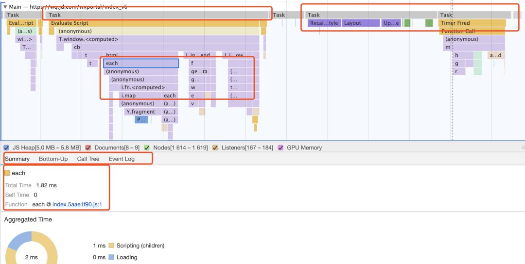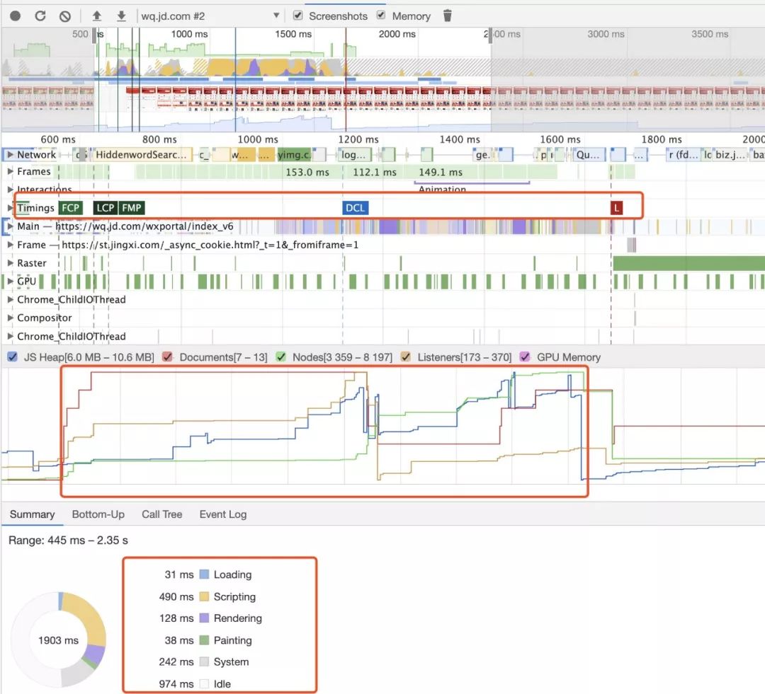 最下方就是页面的一个整理耗时概况,如果 Scripting 时间过长,则说明 js执行的逻辑太多,可以考虑优化js,如果渲染时间过长,则考虑优化渲染过程,如果空闲时间过多,则可以考虑充分利用起来,比如把一些上报操作放到页面空闲时间再上报等。