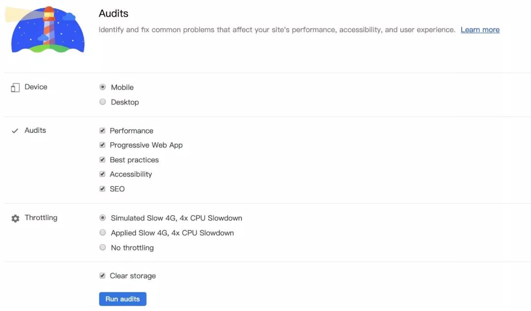 Audits主要从5个方面来给网页打分,当然你也可以去掉某些方面的评估。在选择了设备、评估方面、网络情况等选项后,点击 Run Audits ,我们将会得到一份报告。